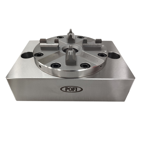 Description: POFI Optimized CNC Pneumatic Chuck, it is compatible with EROWA, it is equivalent a chuck ER-043123 ITS Chuck 100 INOX integrated into a CNC base plate. There are 2 air connections on lateral side of chuck, one is for controlling chuck open or close, the other one is for controlling air go through the holes on top surface. Product requires air pressure 6 bar, clamping force is up to 10000N. It applies to accomdate pallet φ115/φ148, electrode holders and milling on CNC lathe.